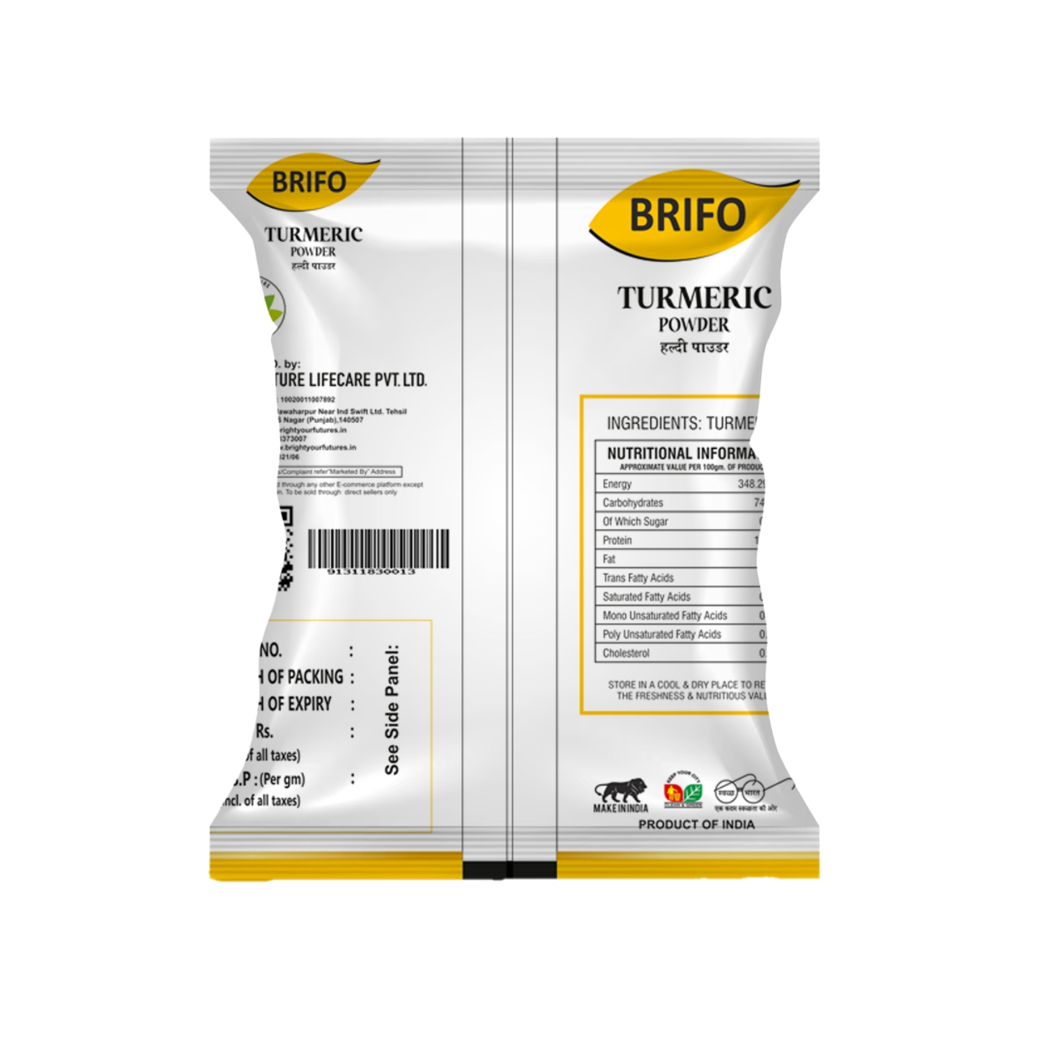 Brifo Turmeric Powder is one of the key ingredients in cooking. The turmeric (haldi) is finely ground and blends in your recipes to give your dishes flavor.